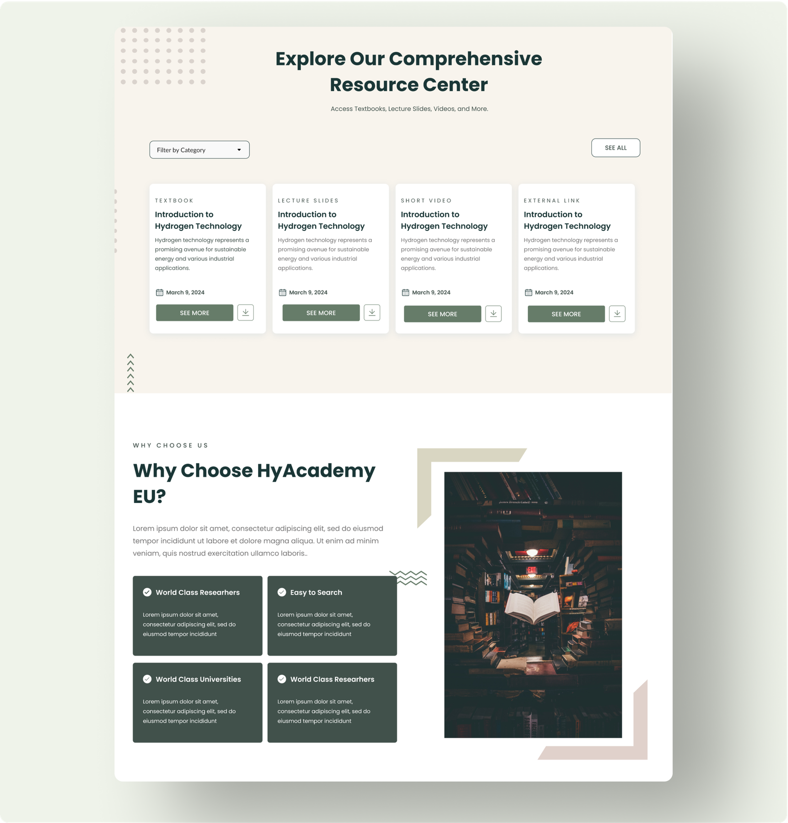 - Resource Center: Designed as the core feature with categorized resources and filtering options (e.g., language, file type).