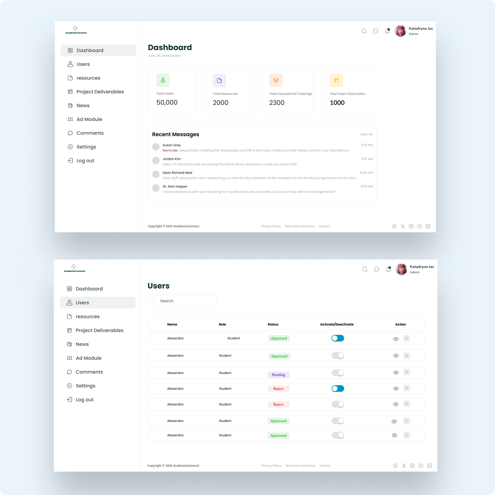- Dashboard: A clean interface showing user statistics, key deliverables, and quick navigation options.